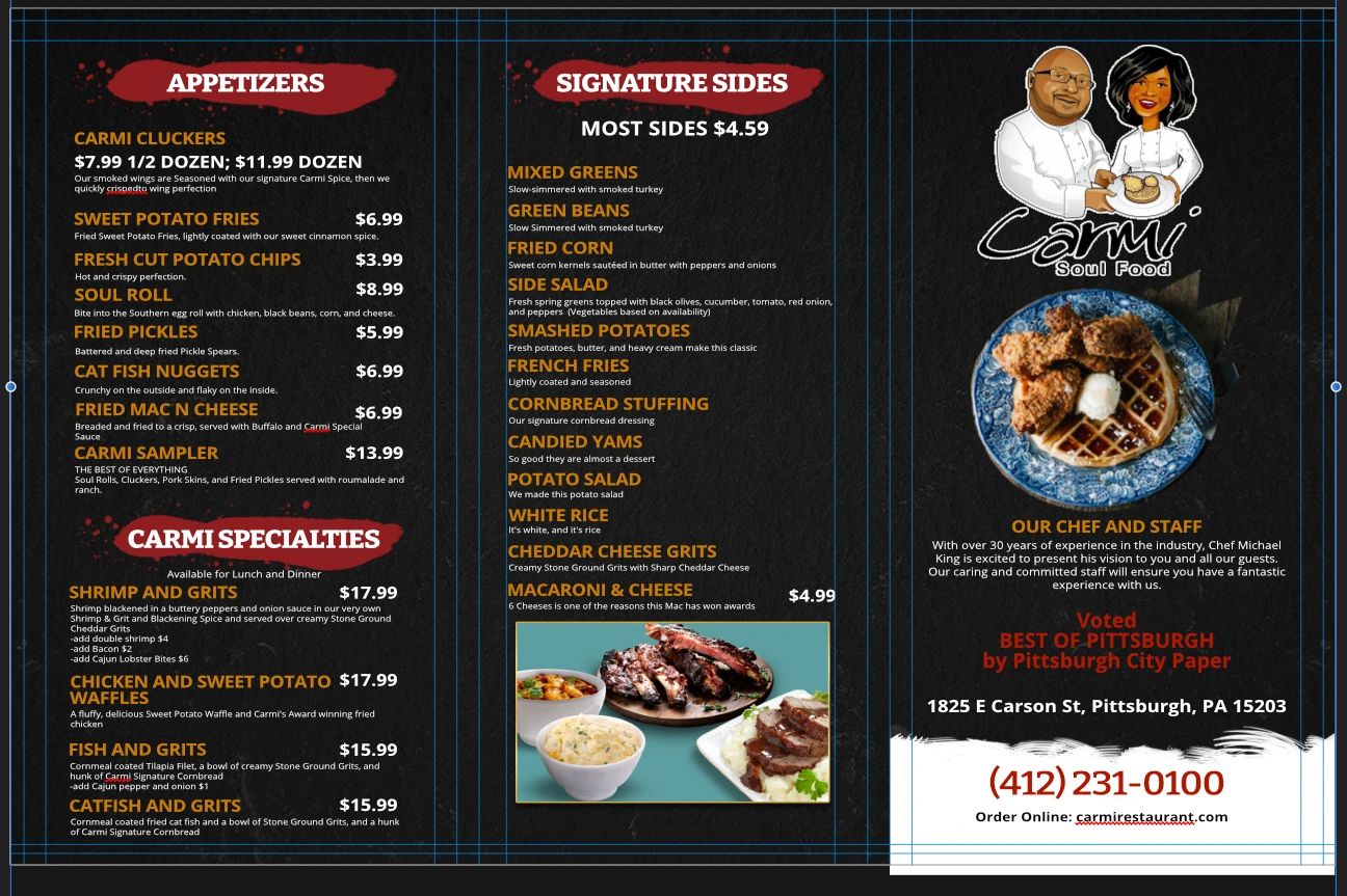 Let us end the debate its pronounced CAR-MY. Carmi Soul Food Menu and Prices No matter what you are hungry for youll find a huge variety of delicious dishes to satisfy you at the Carmi Soul Foods menu. Menu Breakfast - Breakfast - Carmi Specialties Breakfast - Ala Carte Lunch - Entrees Lunch - Sandwiches Lunch - Carmi Specialties Lunch - Soup Salads Lunch - Sides Dinner - Entrees Dinner - Sandwiches Dinner - Carmi Specialties Dinner - Soup Salads Dinner - Sides.